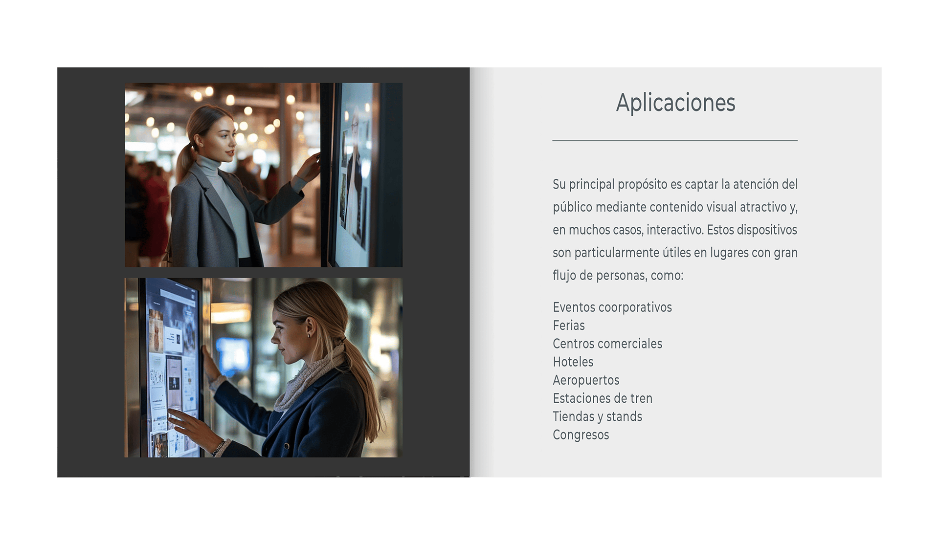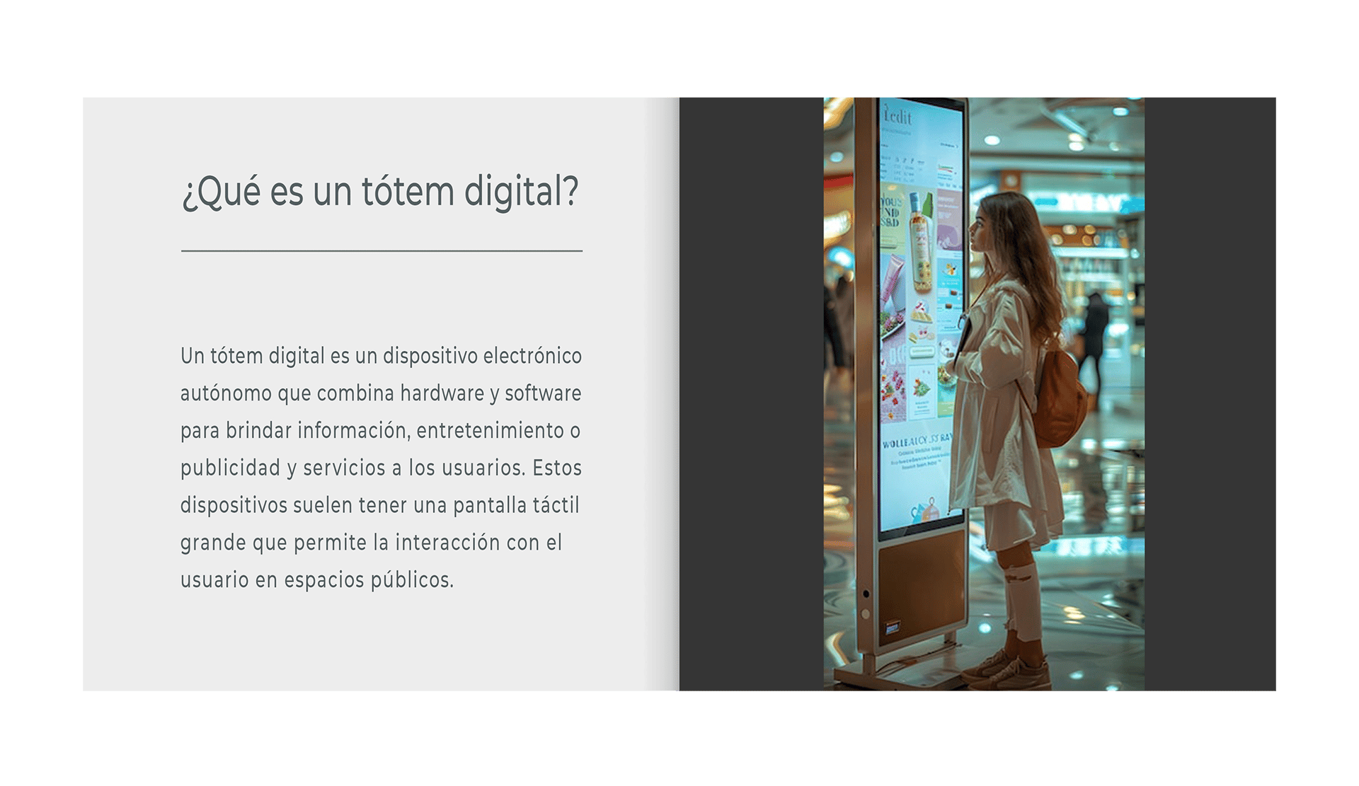 Generan mayor engagement mediante contenido multimedia: videos, mapas interactivos y catálogos digitales tótems digitales responden a estas necesidades con una solución elegante, funcional y adaptable a cualquier entorno, transformando la manera en que las marcas se comunican con sus clientes.